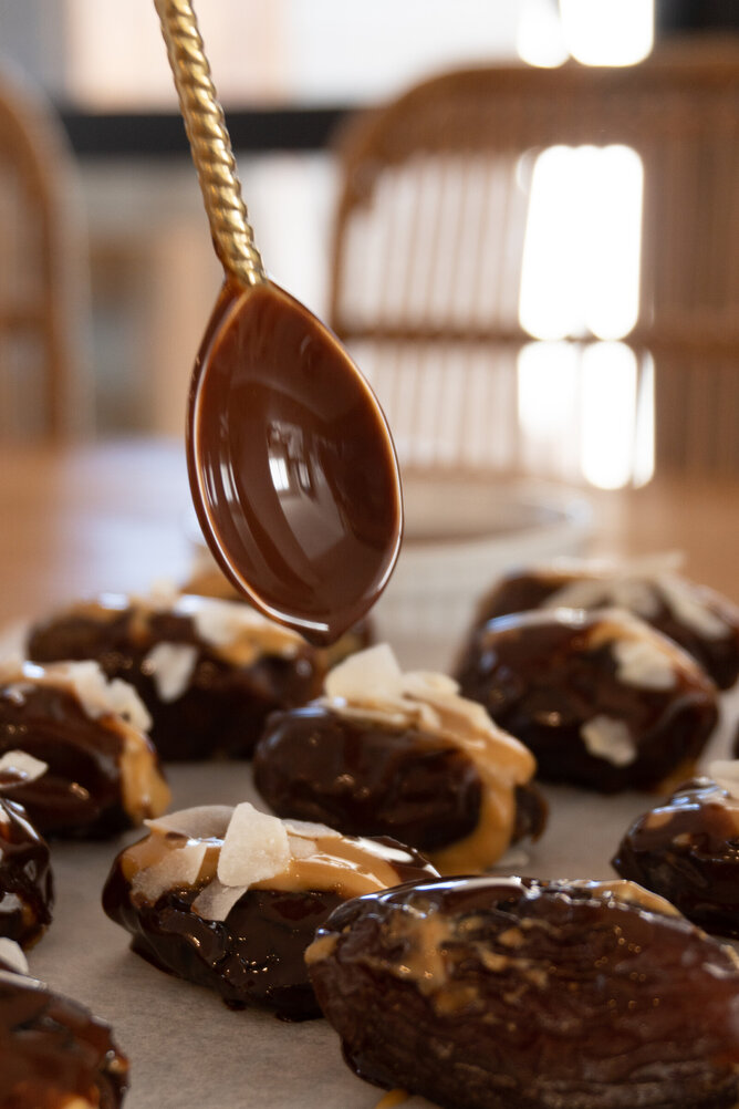 3. Dip the dates into the chocolate and coconut mixture, ensuring they are fully coated. Transfer to a wire rack with a paper towel underneath for the excess chocolate to drip onto.